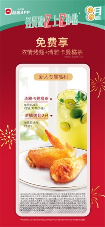 新顾客送美食:初次免费下载即送完全免费情浓烤鸡翅 幽雅卡曼橘茶!限定200万份