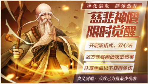 大慈大悲神僧打开覺醒后,将得到使敌军损害最大两位侠客下一次进攻损害减少10%的实际效果,另外将开启附加招数和心决,并将招数心决出示的治疗效果拉涨10%,为我方拳掌类侠客提升20%伤害减免实际效果,能够更强的维护精英团队。剑魂的覺醒也将不断提高本身战斗能力,变成剑队更为超强力的輸出关键。