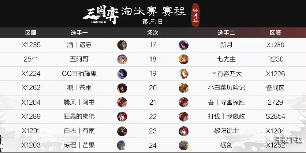 此次淘汰赛的参赛选手赛事日期是8月21~8月22日、8月28日~8月29日2个礼拜天,这四天将争夺出三国弈临兵列阵32强。第一轮淘汰赛选用BO1比赛规则,获胜者不但获得晋升资质,还将得到積分和红包巨奖。日前,第一轮淘汰赛第一阶段的大比拼已完美收官,谁会于勾心斗角的竞技场中杀出重围3?下边公布!